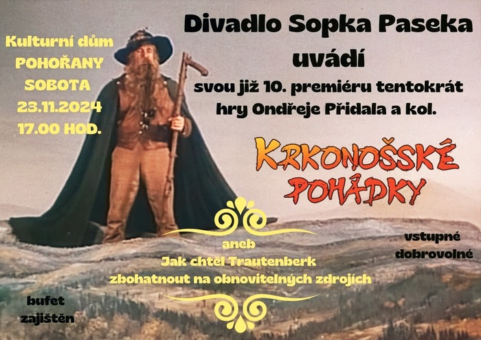 Divadlo Sopka Paseka zve v sobotu 23.listopadu od 17.00 hodin do Kulturního domu Pohořany velké i malé diváky, dospělé i děti na divadelní představení Krkonošských pohádek. Nový díl oblíbeného Večerníku, který divadlo vymyslelo, napsalo a sehraje, se jmenuje Jak chtěl Trautenberk zbohatnout na obnovitelných zdrojích. Sál a divadelní bufet bude otevřen od 16.30 hod. Občerstvení je zajištěno i o přestávce a po skončení divadla. Vstupné dobrovolné. Určitě přijďte v hojném počtu