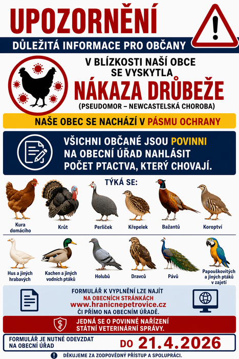 Úvod > Život v obci > Aktuality > Newcastelská choroba drůbeže