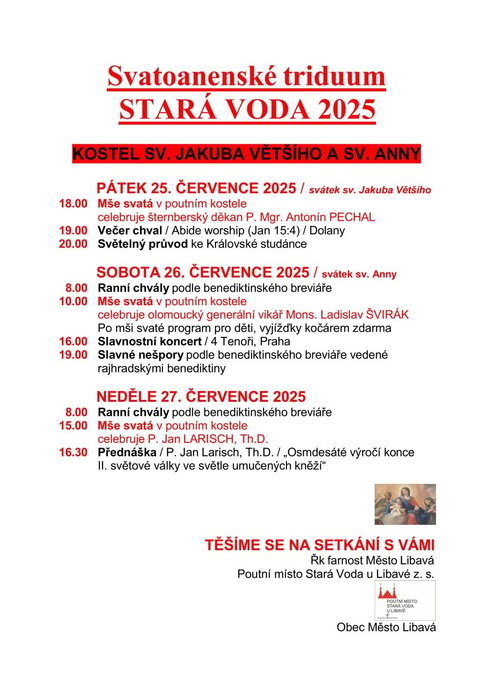 Římskokatolická farnost Město Libavá Vás srdečně zve na pouť, které se koná ve dnech 25. až 27. července 2025 v kostele sv. Jakuba většího a sv. Anny. Toto Svatoanenské triduum začíná v pátek 25. července v 18:00 mší svatou, kterou celebruje šternberský děkan P. Mgr. Antonín Pechal, v sobotu 26. července je pak mše svatá v 10:00 sloužená olomouckým generálním vikářem Mons. Ladislavem Švirákem a v neděli následuje mše svatá v 15:00, tu celebruje P. Jan Larisch. Další podrobnosti o programu naleznete níže na přiloženém plakátku.