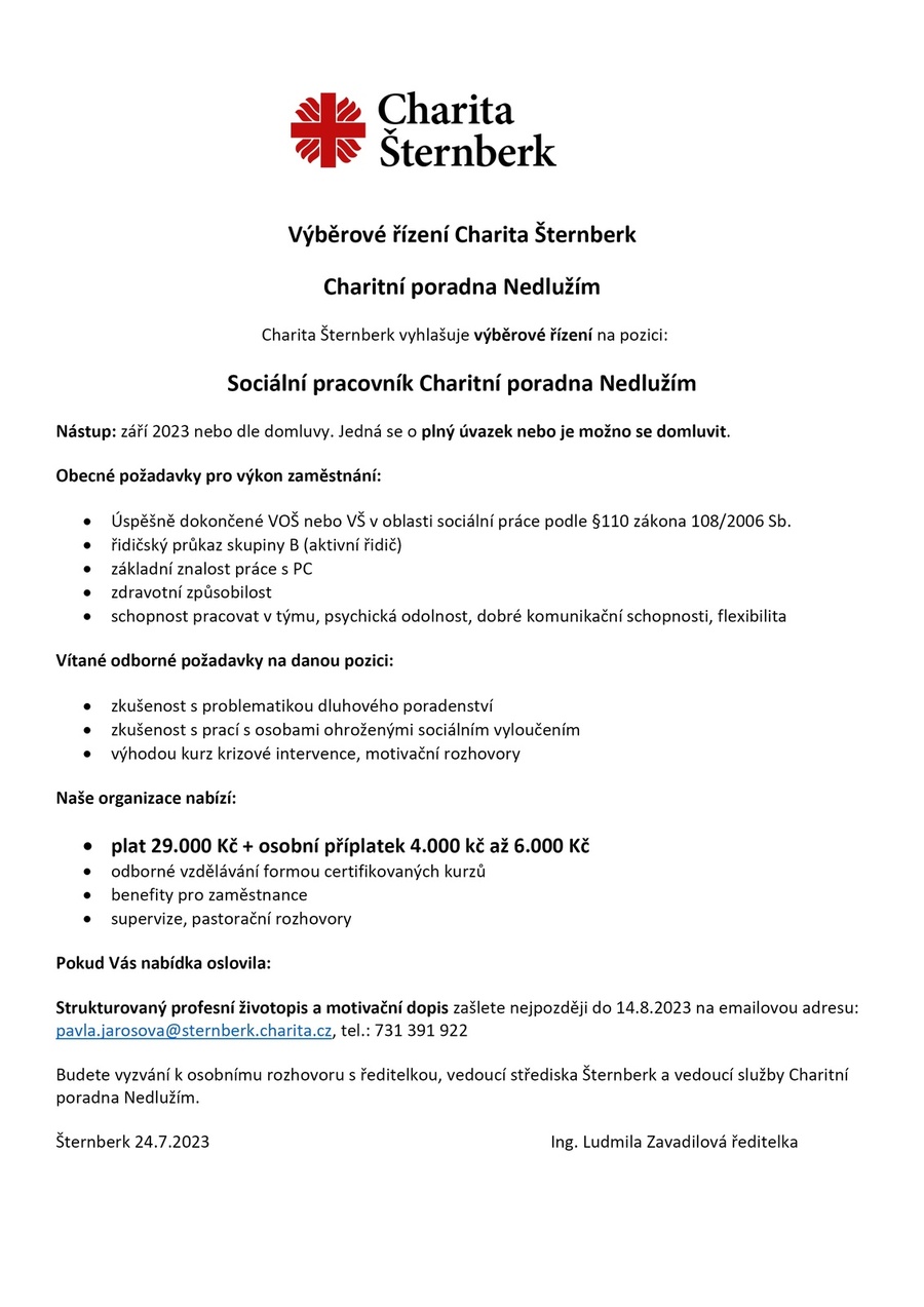 Úvod > Život v obci > Aktuality > Volné pracovní místo - sociální pracovník Charita Šternberk
